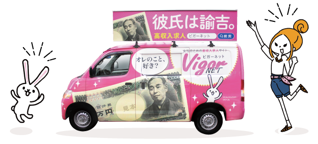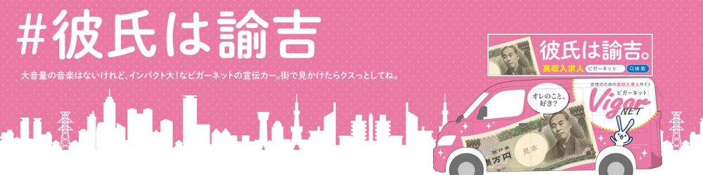 高収入求人サイト「ビガーネット」が掲げるキャッチコピーです。実在するお店のみを掲載した女性のための求人情報を日々、更新中♪ インパクト大!の宣伝ワゴンと「彼氏は諭吉」のパワーワードはTwitterで盛り上がり中♪街で見かけてクスっとしたら、ぜひ写真とともにツイートしてね♡