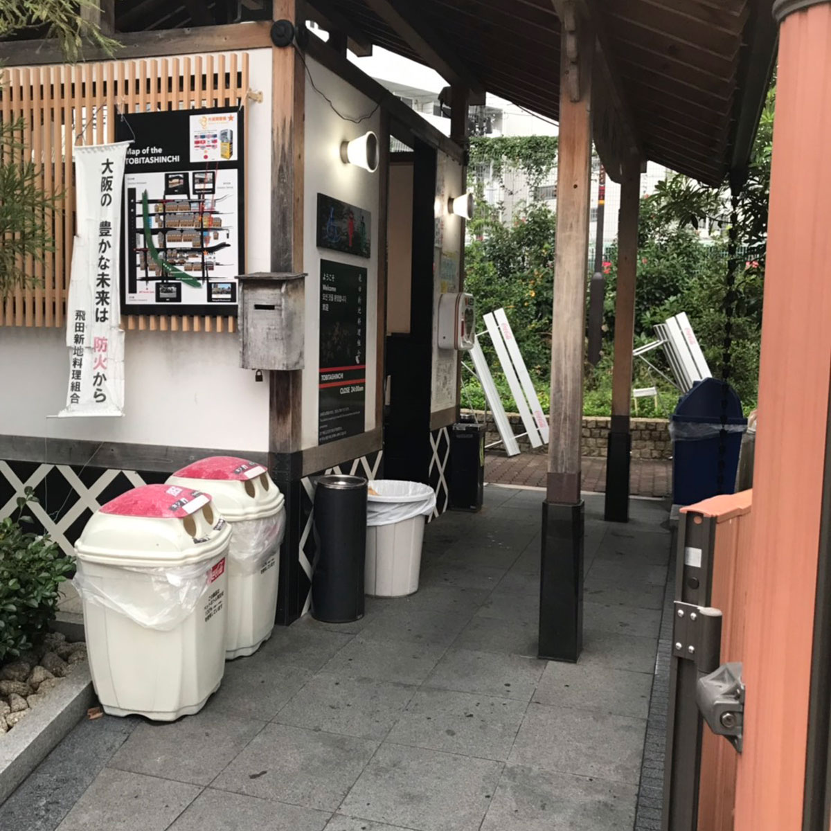 車で堺筋を南へ進み、あびこ筋をすぎてしばらくすると飛田新地料理組合へは左折を指示する白い看板が出てきます。その通りは大門通りといいますがそこをしばらく進んで阪神高速の高架下、飛田新地の入り口に公衆トイレがあります。飛田新地で遊ぶ男性客がひっきりなしに出入りしているこちらには自動販売機のある喫煙所もあります。遊び終わったお客さん同士の待ち合わせスポットとしてもよく使われていますよ。